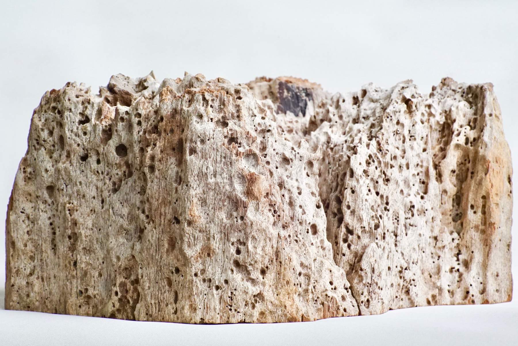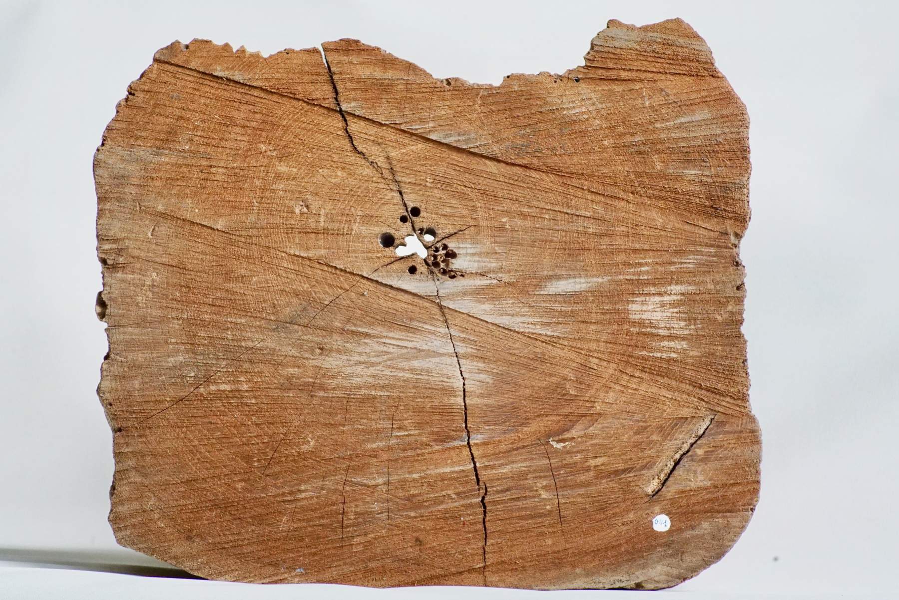 This piece of Teak wood is the end of a baulk (a roughly squared beam) that was cut from the forest of Myanmar (then Burma) at the beginning of the twentieth century. It was part of a shipment of timber that was travelling on the SS Pegu from Yangon (then Rangoon) to Liverpool in 1917. The SS Pegu was sunk by a German U-boat off the coast of Galway where she and her shipment of teak remained until 2011. Working from German war records, a salvage company was able to locate the SS Pegu and reclaim the wood that had spent almost one hundred years on the bottom of the sea and another hundred years growing in the Burmese forests.