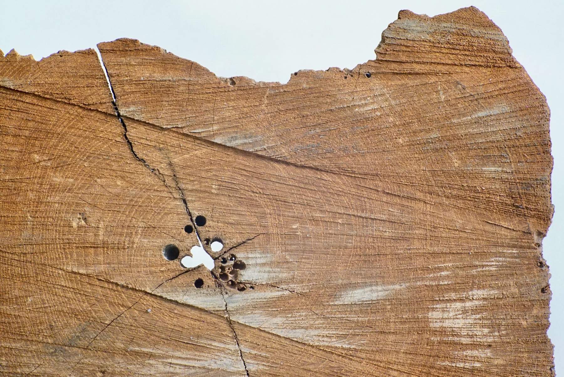 The baulks were in excellent condition, except for the last 30cm or so that you see here which has been burrowed into and occupied by gribble worms – 56 species of crustacean in the Limnoriidae family. The rest of this baulk was used in the construction of our Bethnal Green Memorial project.