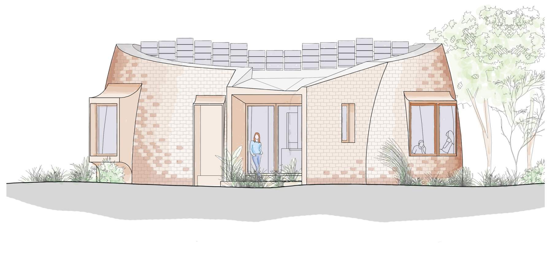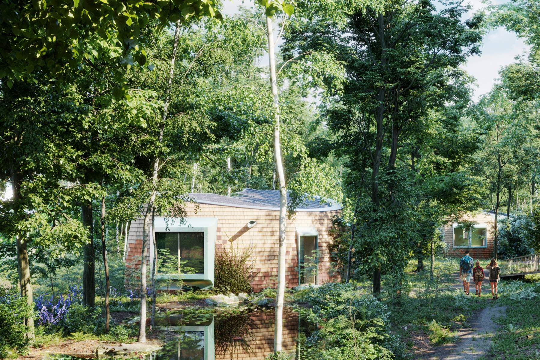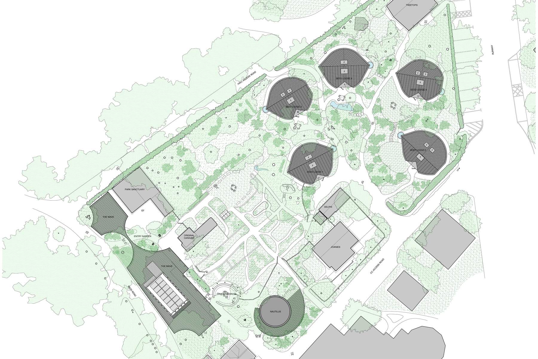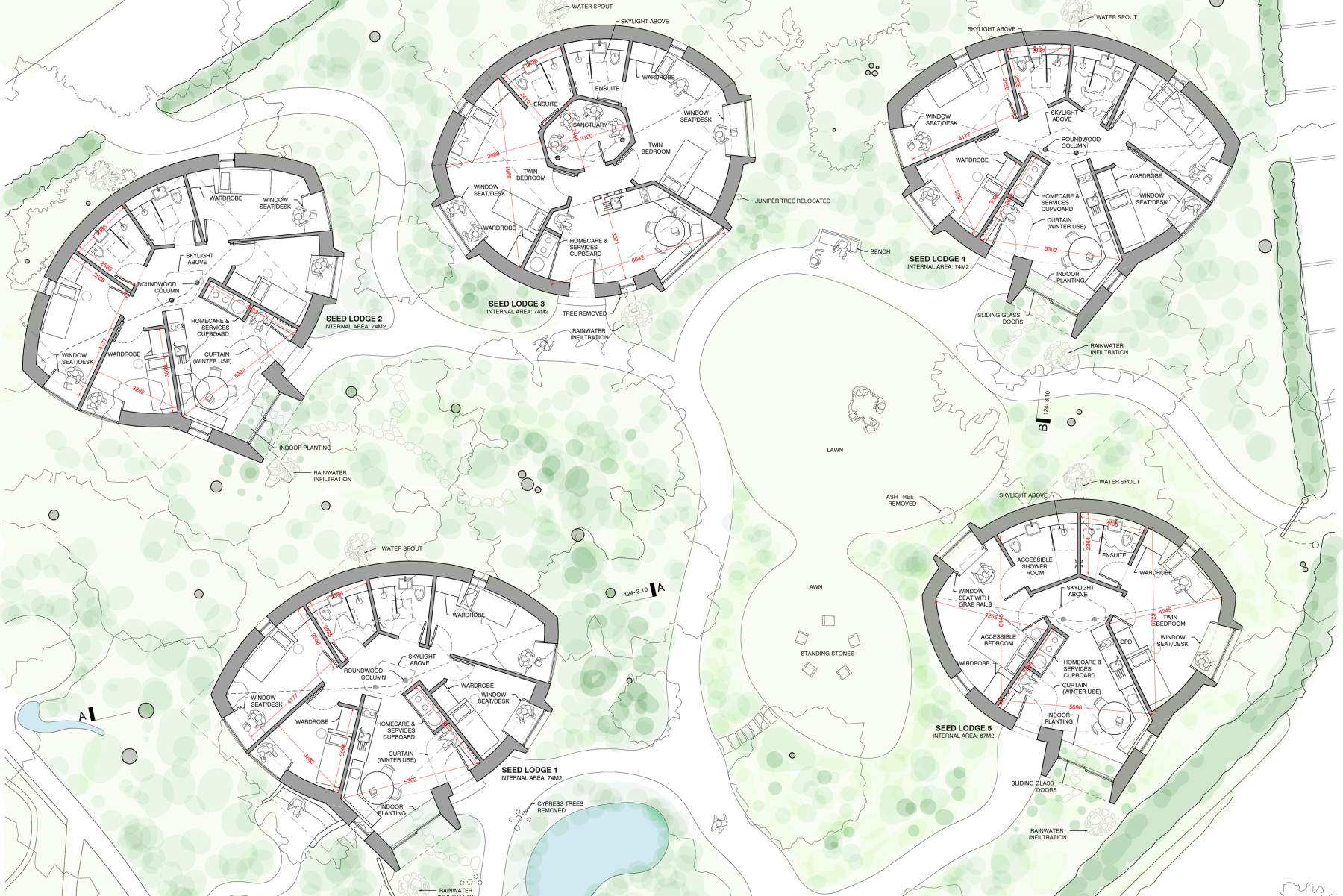 The Seed Lodges are five small buildings that offer guest accommodation to visitors of the Foundation who are attending their educational programmes, workshops and other events. They are envisioned as natural artefacts that have grown out of their garden setting. Each lodge provides three or four beds as well as kitchen, living and dining spaces. They are timber framed structures that sit on micro-pile foundations fitting closely within the existing trees and planting with minimal disturbance. Their curved forms are covered with a tiled cladding that is ceramic where needed to manage moisture or fire risks and wood shingles elsewhere.