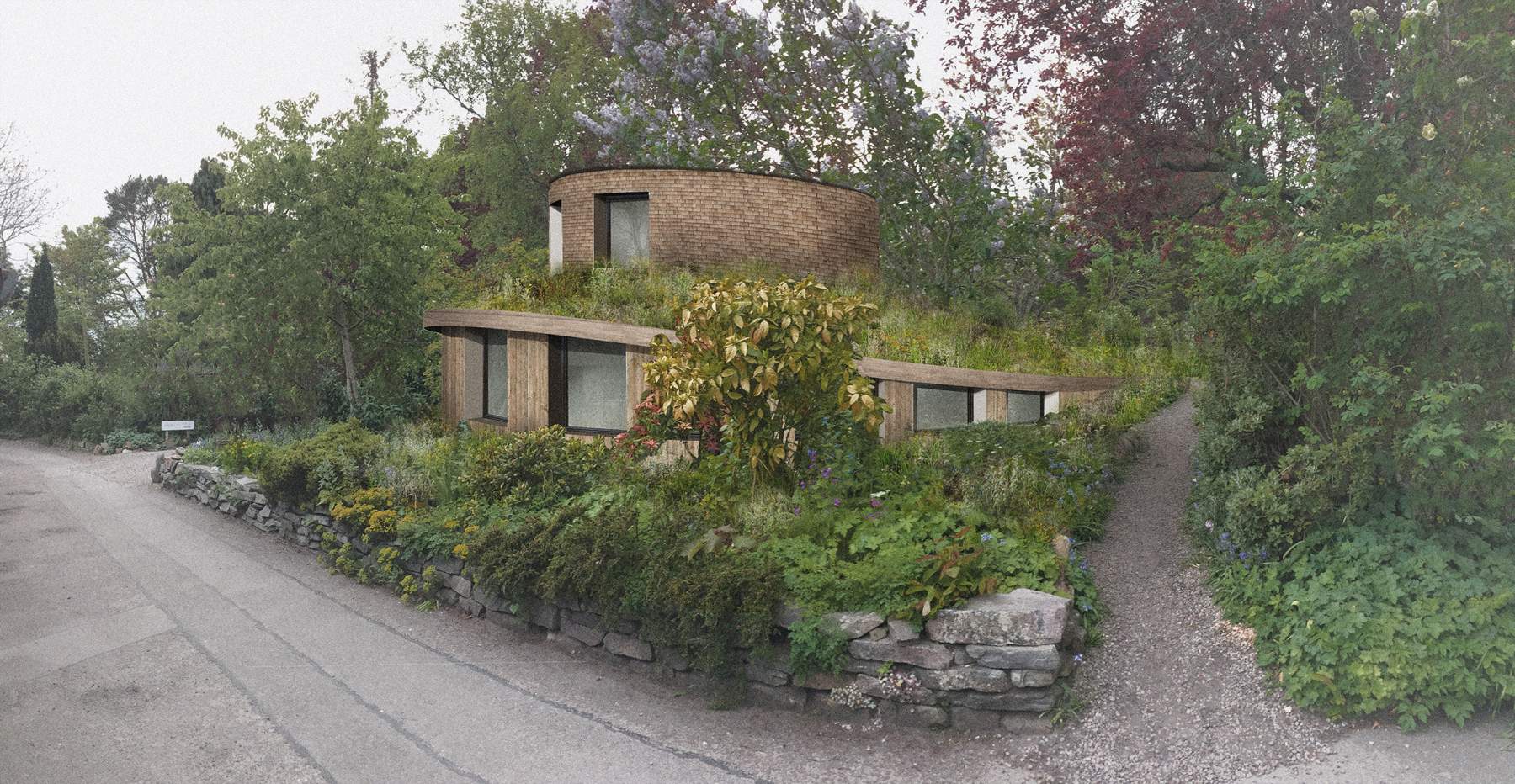 Nautilus is a second administration building that also provides office and meeting spaces. It is located on a corner of the site where key pedestrian paths intersect and thus has a form that holds this corner and activates the street frontage. Its round form compliments its visibility from many viewpoints and it is set back into the earth bank giving the sense that it has emerged from the Original Garden behind.