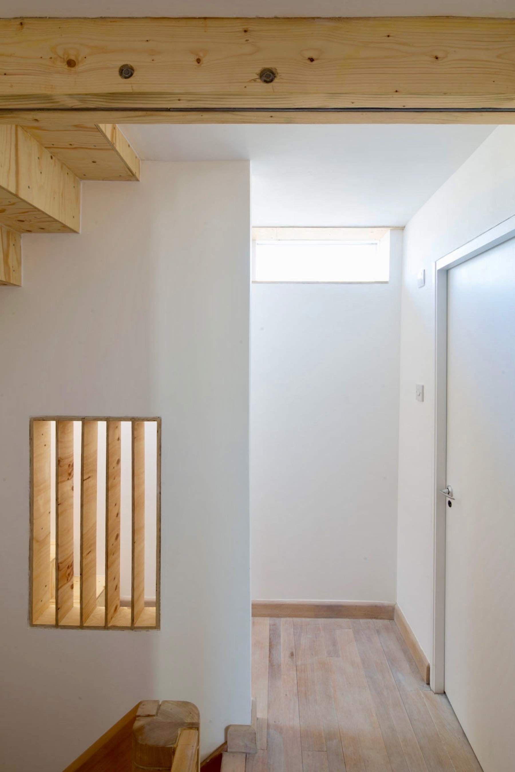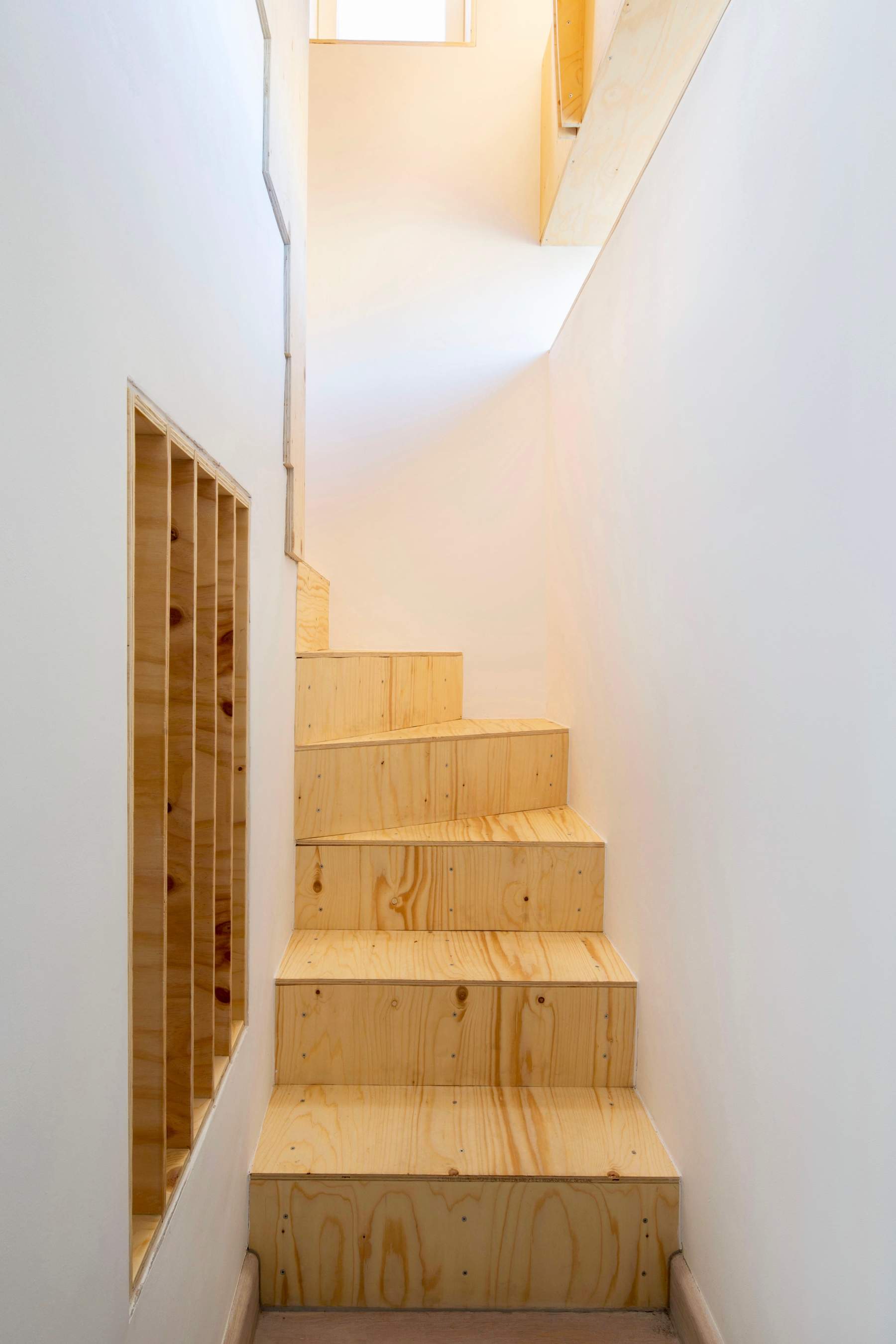 Loft Library responds to the client’s brief to provide 40 linear meters of book storage for a two-storey end of terrace house in Walthamstow, East London. The construction of the house built in the 1980’s was brick cavity walls with a trussed rafter roof. The single pitch of the roof formed a space at one end of the loft which was not easy to access due to the proliferation of diagonal members in the timber trusses. As the client’s budget was limited, it was decided to work within the fabric of the existing building rather than create a new loft structure or extension. By replacing the diagonal truss members with plywood arches the Loft Library was formed with a stair access, small bench, shelves between arches and a study space at the end.