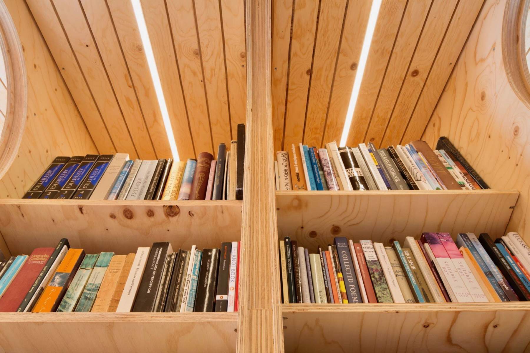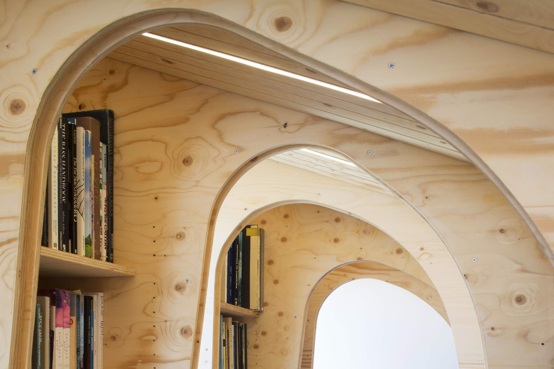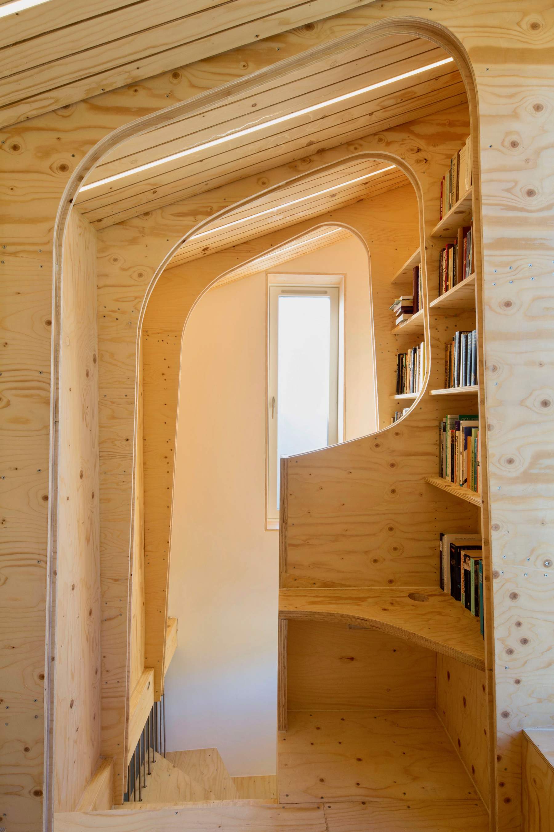 The material used for all surfaces was 18mm spruce plywood. For the curved arches detailed measurements were taken of the existing loft space by Arboreal, templates drawn in CAD and plywood elements cut precisely to size and shape by the CNC cutting service Cut & Construct. The plywood elements were provided to the main contractor as a “client supply” item and had screw-holes and item numbers cut into the material to ensure quick and easy assembly. Three vertical triple glazed windows were installed on the north elevation between the trussed rafters to provide light and rhythm to the library and study space. An additional window on the west elevation was installed to catch the warm evening sun.